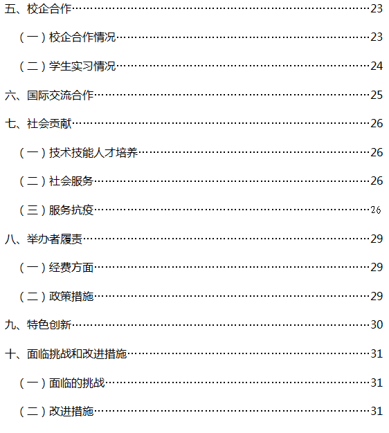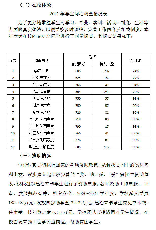 目 录 一、学校情况………………………………………………………………………4 (一)学校概况…………………………………………………………………4 (二)学生情况…………………………………………………………………4 (三)教师队伍…………………………………………………………………5 (四)设施设备…………………………………………………………………5 二、学生发展………………………………………………………………………6 (一)学生素质…………………………………………………………………6 (二)在校体验…………………………………………………………………7 (三)资助情况…………………………………………………………………7 (四)就业质量…………………………………………………………………8